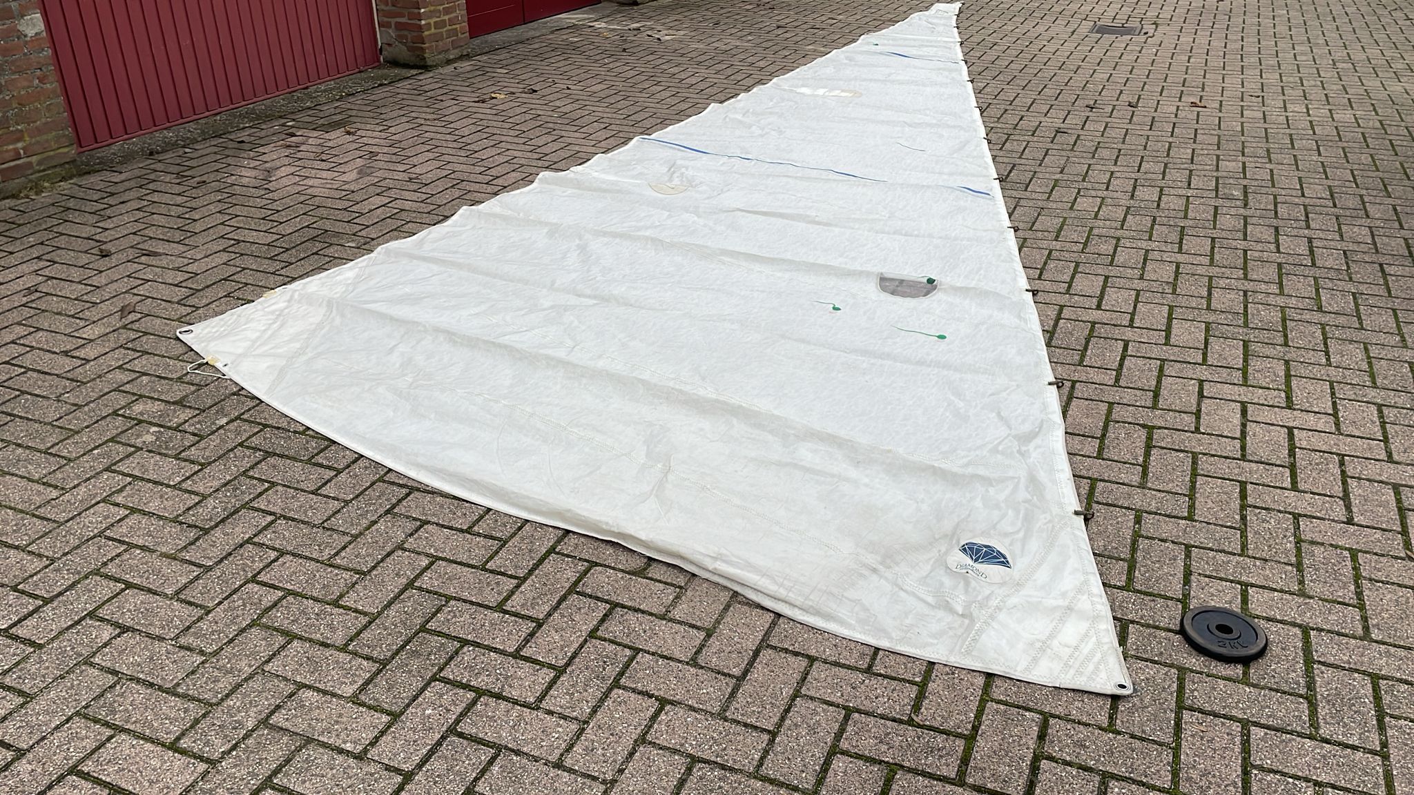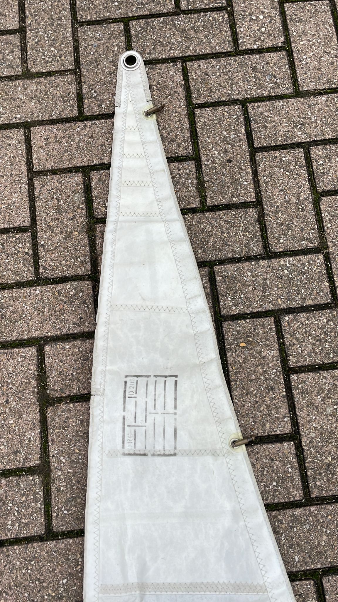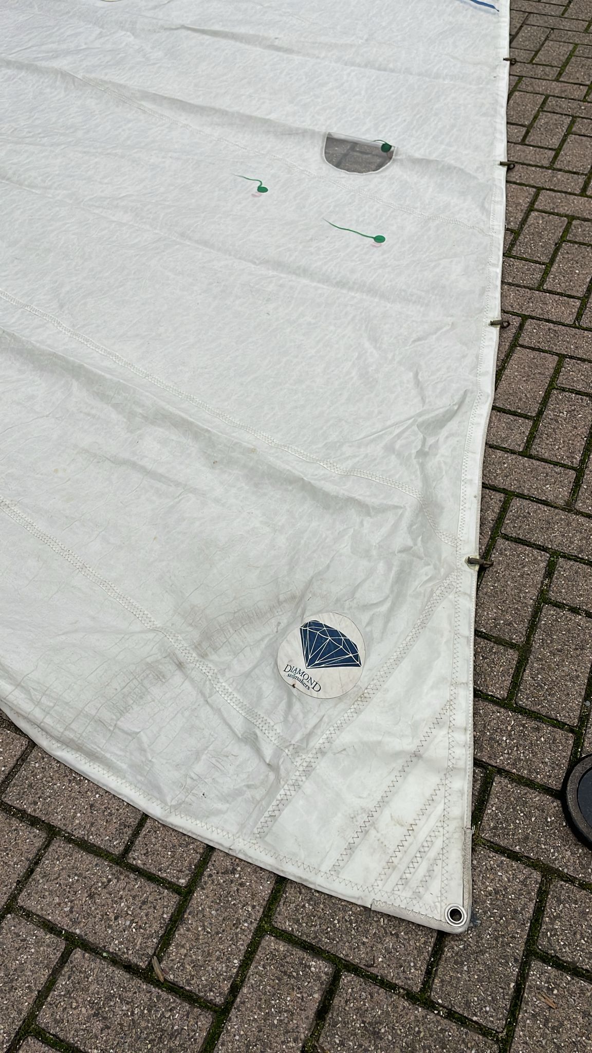 Leuk zeiltje voor weinig. Gemaakt door Diamond Sailmakers. Zitten aardig wat plakkers en reparaties in het zeil. Verder ziet het er nog goed uit. Met telltales, raampje voor beter zicht, mooi blauw accent. Leuk als reservezeil, aanvulling aan je zeilgarderobe, of gewoon voor de zeiler met beperkt budget!