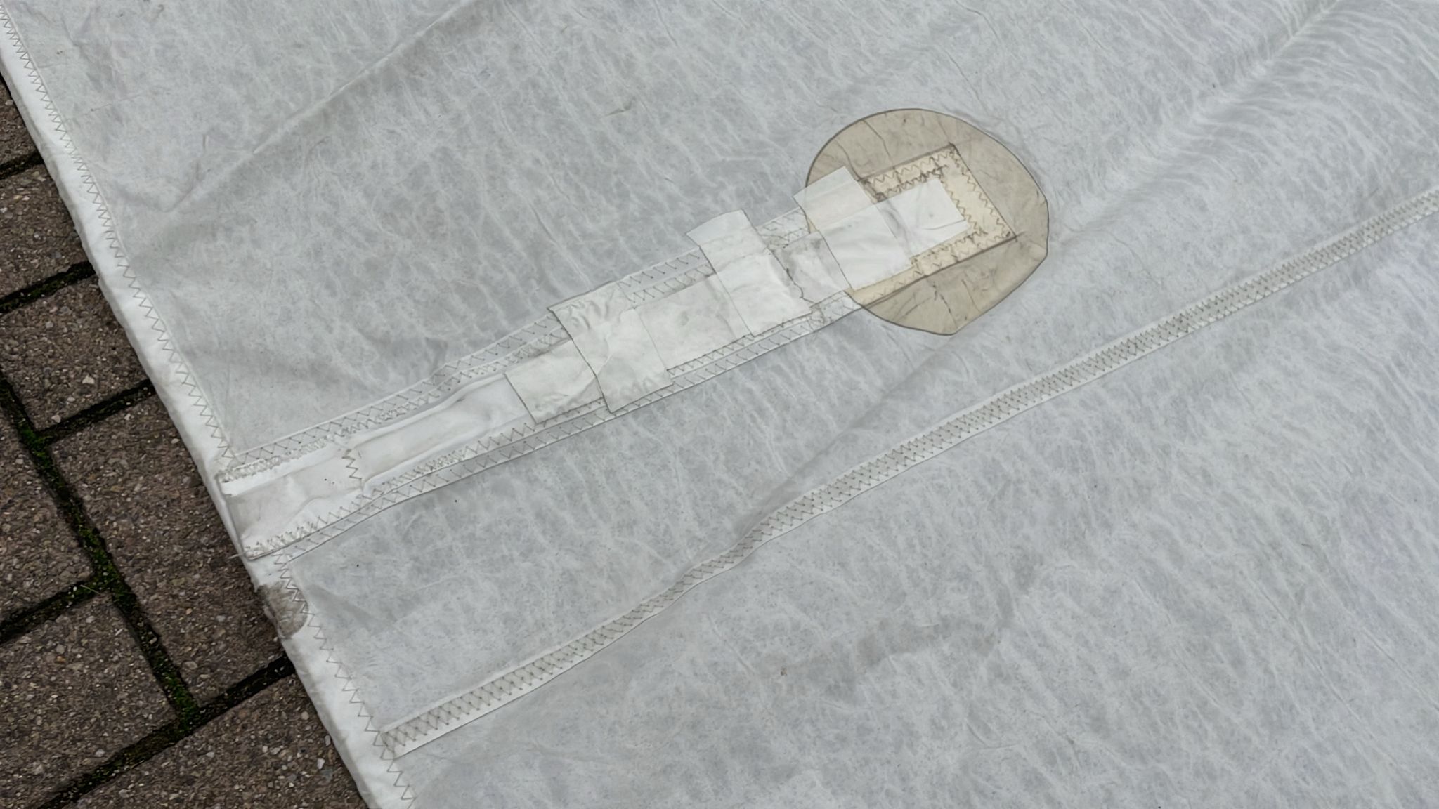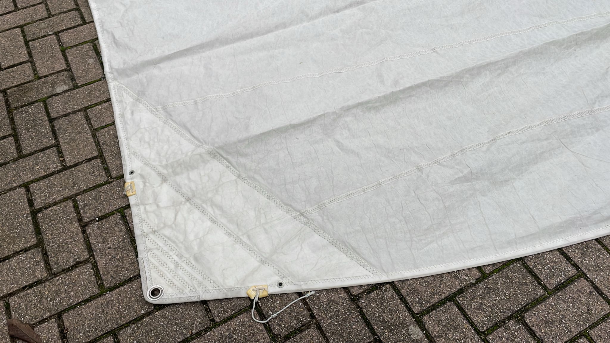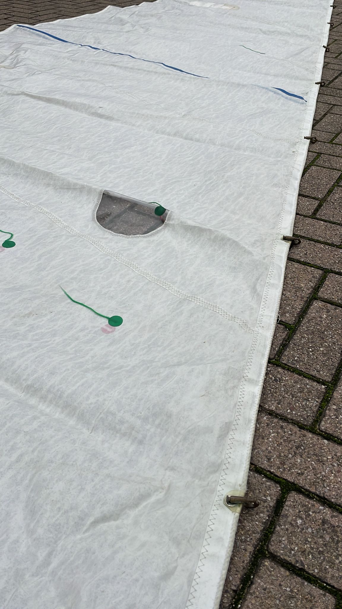 Leuk zeiltje voor weinig. Gemaakt door Diamond Sailmakers. Zitten aardig wat plakkers en reparaties in het zeil. Verder ziet het er nog goed uit. Met telltales, raampje voor beter zicht, mooi blauw accent. Leuk als reservezeil, aanvulling aan je zeilgarderobe, of gewoon voor de zeiler met beperkt budget!