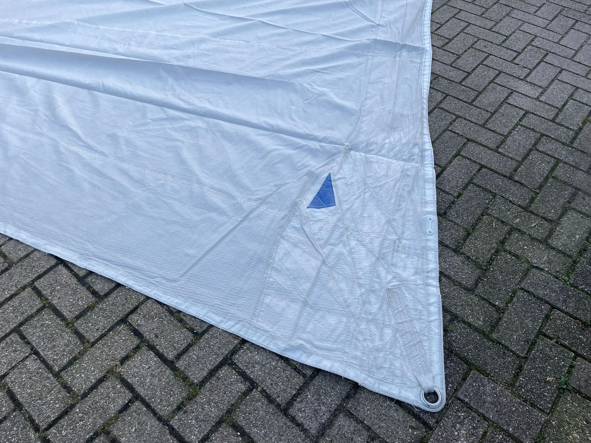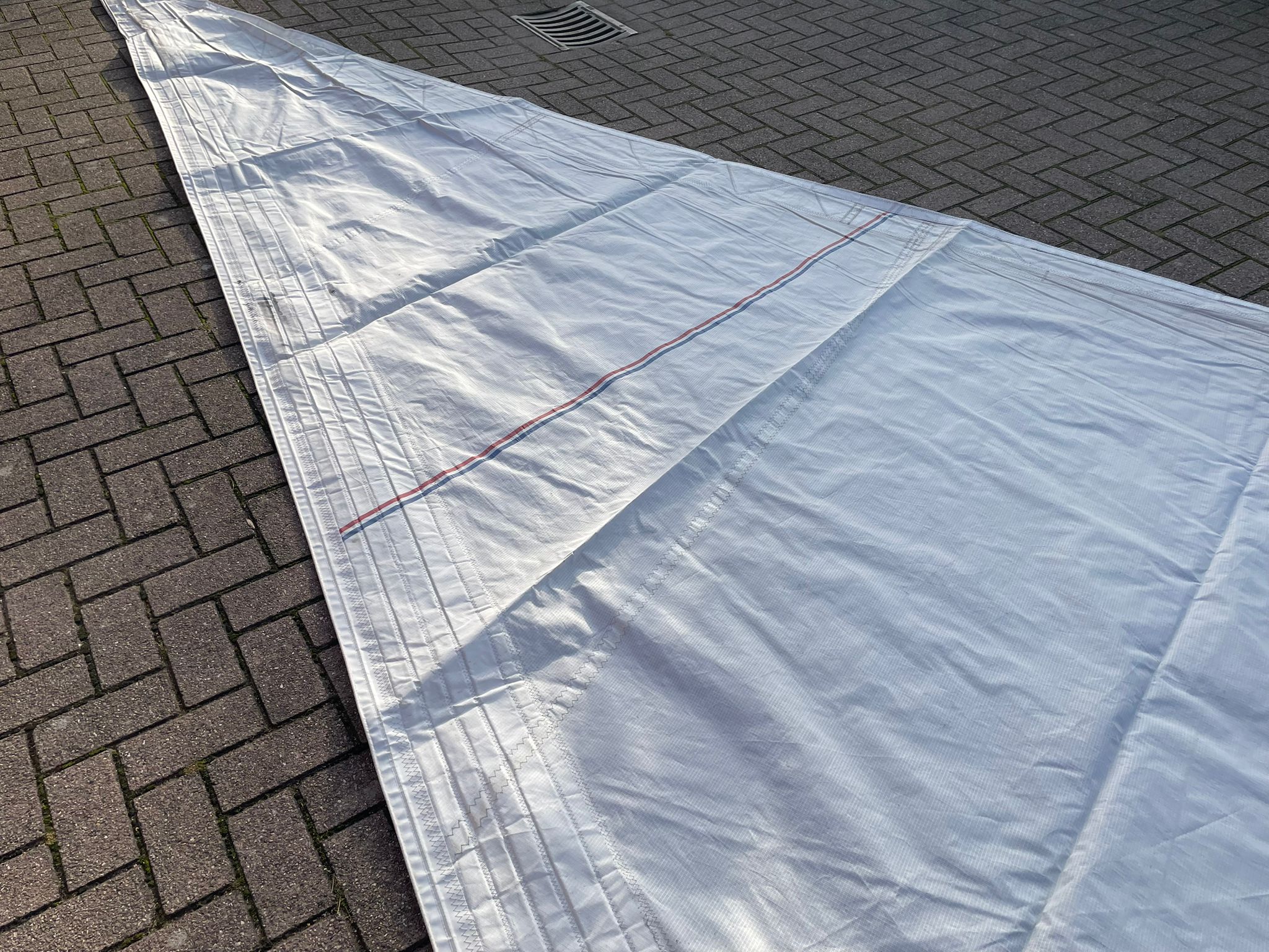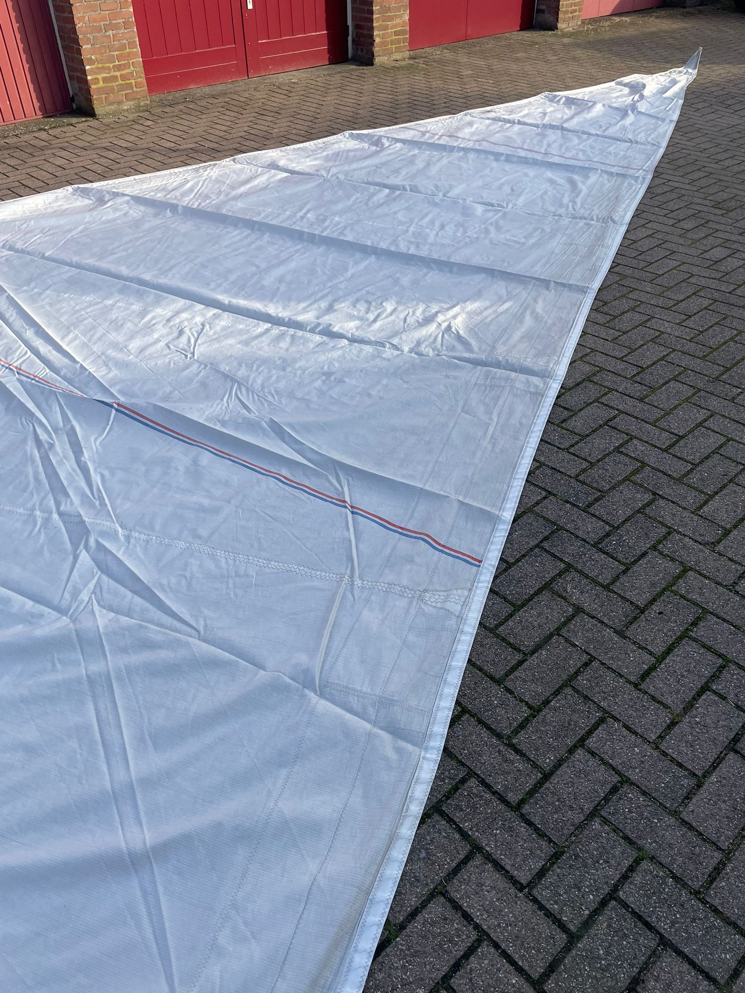 Wat oudere genua maar nog in nette staat. Mooi wit doek met rood-wit-blauw accent – lekker Hollands! Met reefschuim in het voorlijk, hierdoor behoudt het zeil beter zijn vorm bij rolreven waardoor je hoger/sneller kan zeilen en minder geklapper krijgt in je achterlijk. Met 5,8m onderlijk een flinke lap, mooi allround zeil voor weinig geld.