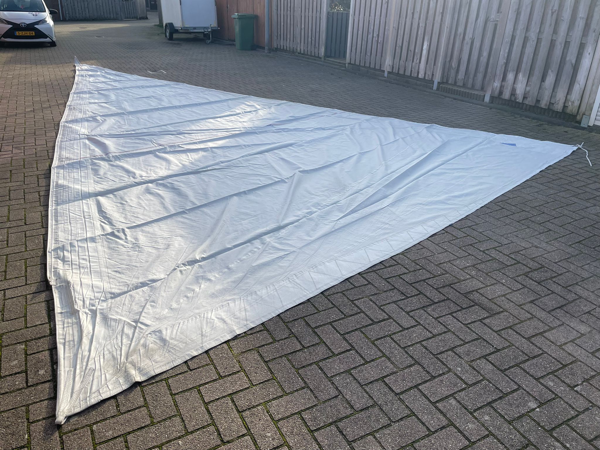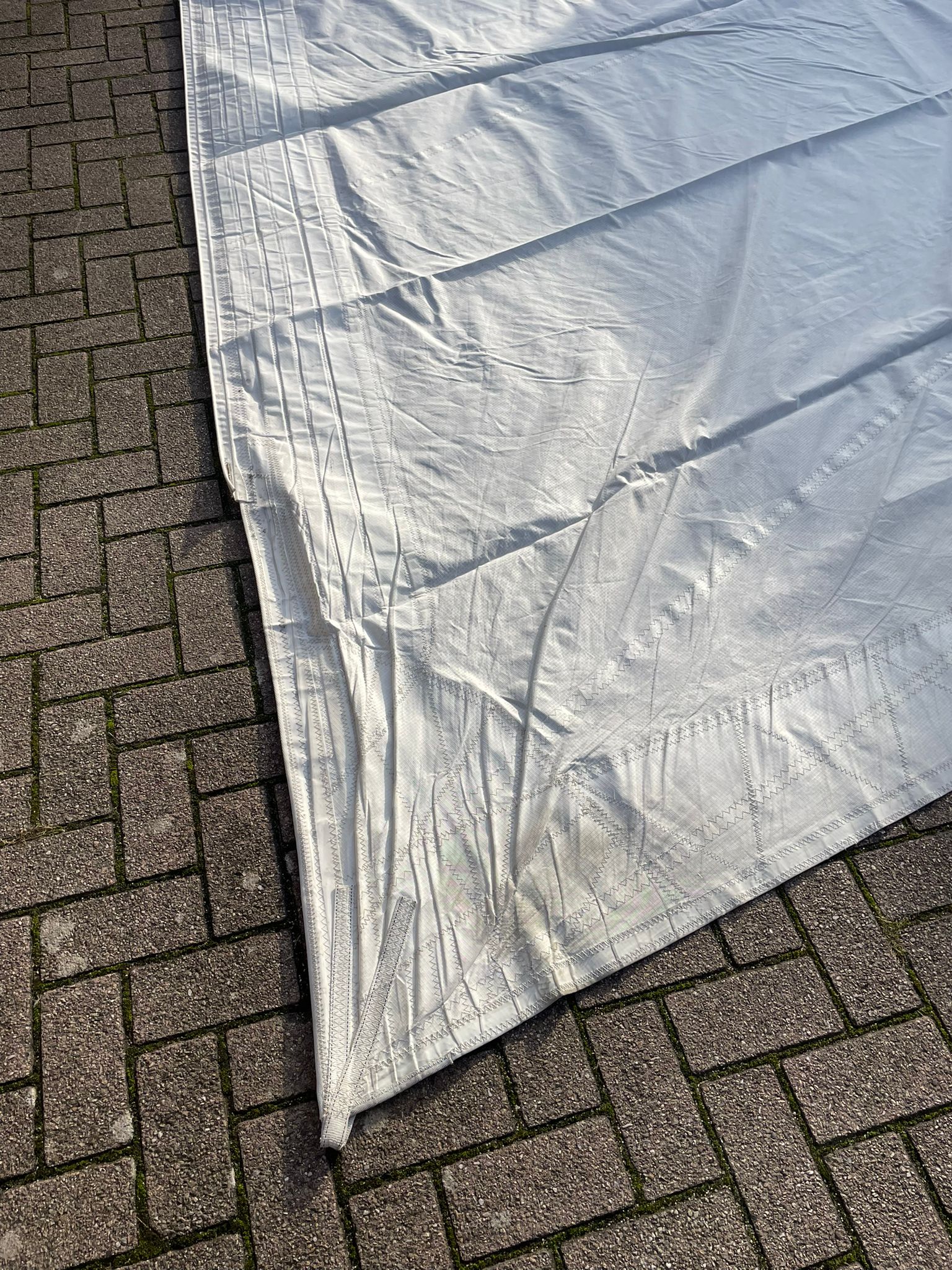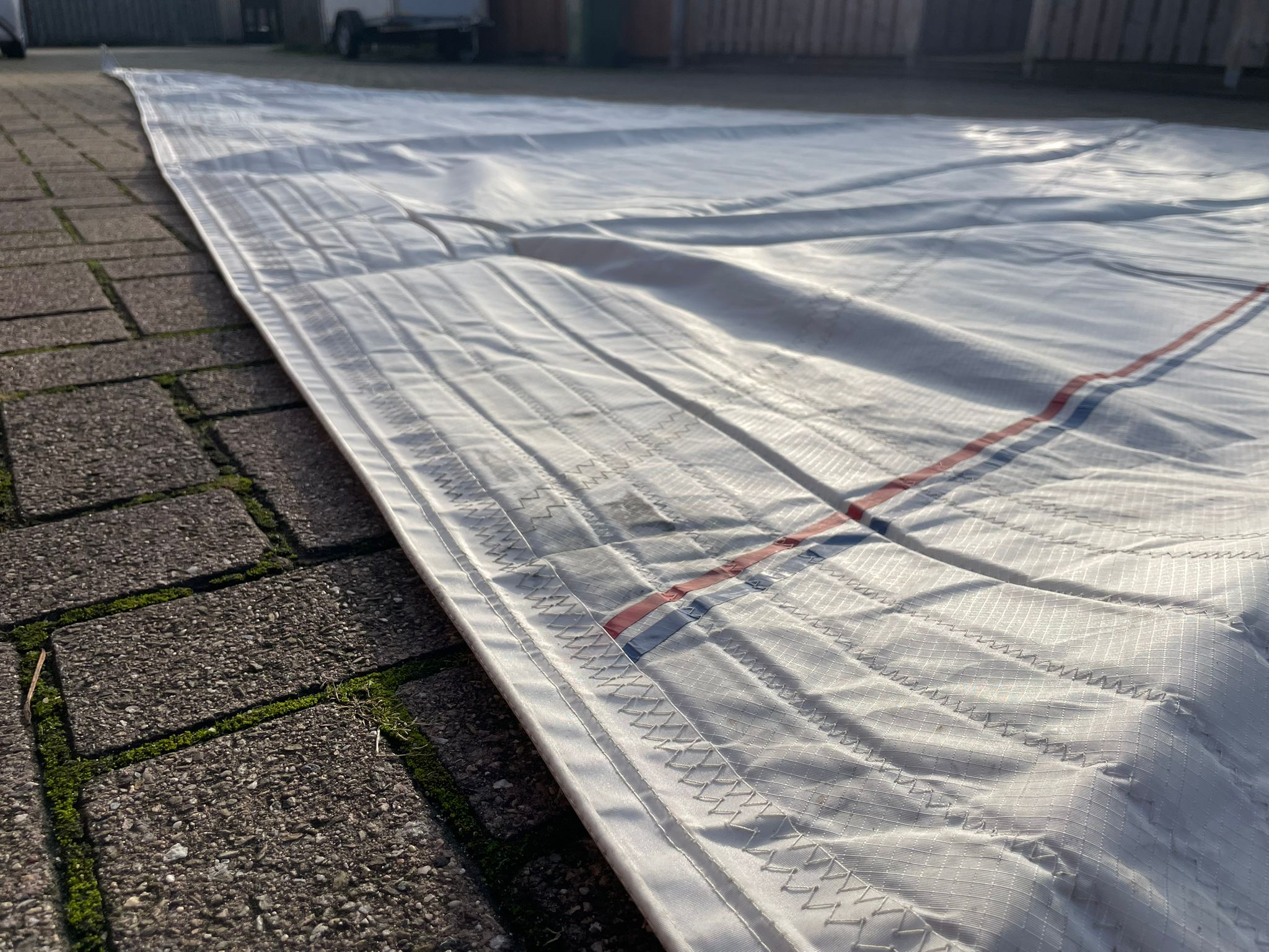 Wat oudere genua maar nog in nette staat. Mooi wit doek met rood-wit-blauw accent – lekker Hollands! Met reefschuim in het voorlijk, hierdoor behoudt het zeil beter zijn vorm bij rolreven waardoor je hoger/sneller kan zeilen en minder geklapper krijgt in je achterlijk. Met 5,8m onderlijk een flinke lap, mooi allround zeil voor weinig geld.